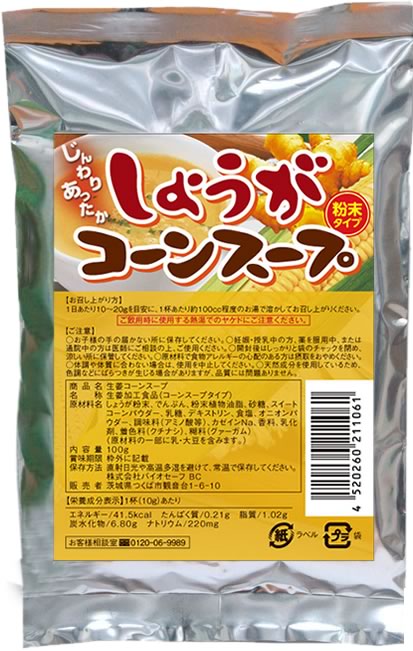 じんわりあったか 生姜ダイエットスープ生姜コーンスープ 価格: 980円 レビュー評価:0.0 レビュー数:0 商品名 生姜コーンスープ 名称 生姜加工食品(コーンスープタイプ) 原材料名 しょうが粉末、でんぷん、粉末植物油脂、砂糖、スィートコーンパウダー、乳糖、デキストリン、食塩、オニオンパウダー、調味料(アミノ酸等)、カゼインNa、香料、乳化剤、着色料(クチナシ)、糊料(グァーガム)(原材料の一部に乳・大豆を含みます。) 栄養成分表示1杯(10g)あたり エネルギー/41.5kcal 、たんぱく質/0.21g、脂質/1.02g、炭水化物/6.80g、ナトリウム/220mg 内容量 100g 召し上り方 1日あたり10-20gを目安に、1杯あたり約100cc程度のお湯で溶かしてお召し上がり下さい。 ご Supported by 楽天ウェブサービス |